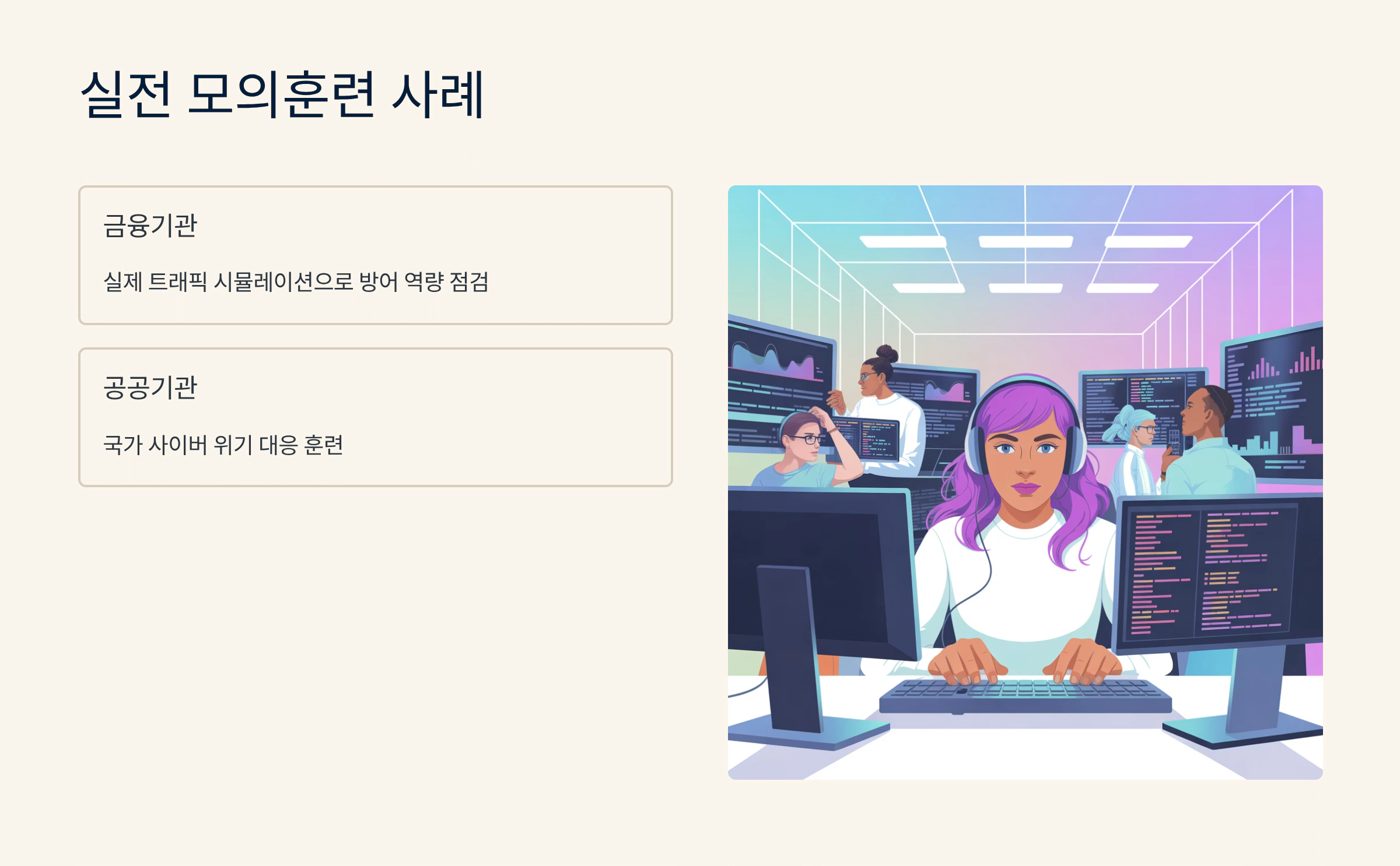 ✔ 교육 및 훈련: 실제 공격 상황을 체험하며 대응 역량을 강화하는 실전 연습이에요.